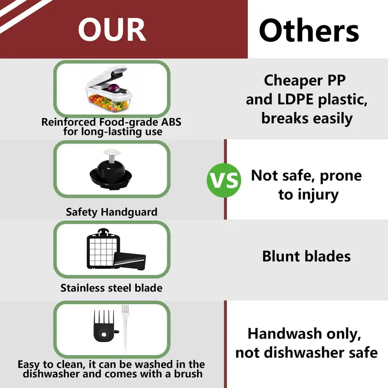 The integrated collection container catches everything you chop, so you can measure, mix, and even store ingredients directly. Prep an entire salad in minutes—chop lettuce, slice tomatoes, shred carrots, and dice onions all with one tool.